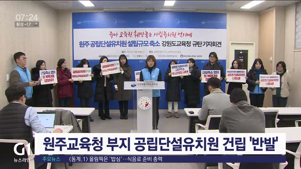 전교조 강원지부와 강원실천교육교사 모임 등 단체들은 어제(10일) 도교육청에서 기자회견을 열고, 원주 공립단설유치원 건립 축소 계획을 중단하라고 촉구했습니다.