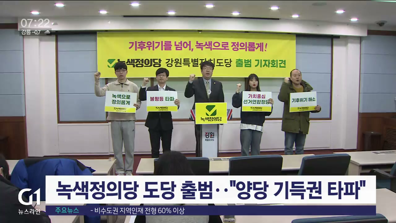 녹색정의당 도당은 강원자치도청 브리핑룸에서 기자회견을 열고 "기후위기와 불평등 해소, 양당 기득권 타파를 기치로 새로운 정치 체제와 사회변화를 위해 나아가겠다"고 밝혔습니다.