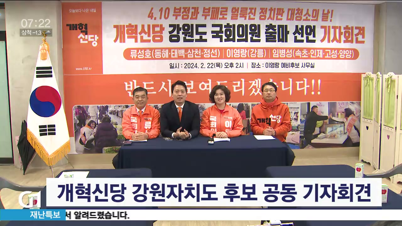 개혁신당은 이기인 중앙당 대변인을 비롯해 강릉 이영랑, 동해태백삼척정선 류성호, 속초인제고성양양 임병성 후보가 참석한 가운데 22대 총선 출마의 변을 밝히고 완주를 다짐했습니다.