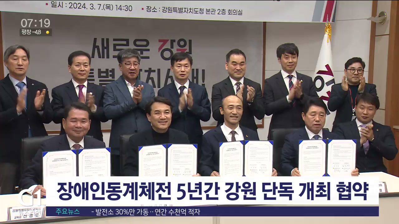 김진태 도지사는 어제(7일) 도청에서 정진완 대한장애인체육회장과 권혁열 도의장, 신경호 교육감과 함께 전국 장애인동계체육대회 강원자치도 단독 개최를 위한 업무 협약을 체결했습니다.