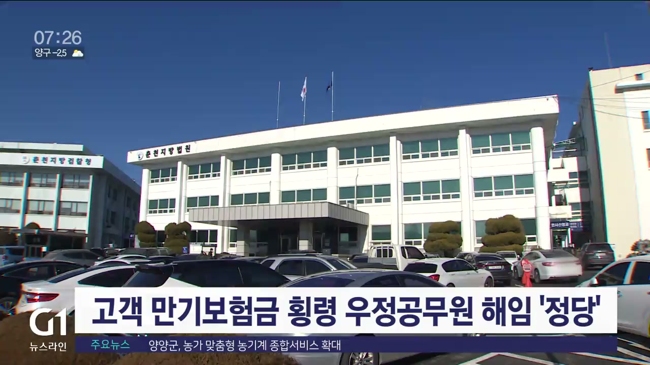 A씨는 지난 2021년 고객의 만기보험금 4천 6백여만 원 중 320여만 원을 횡령해 강원지방우정청으로부터 해임 처분을 받았습니다.