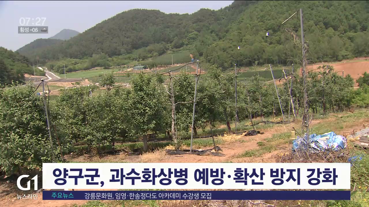 양구군은 과원 예찰, 의심 증상 전염원 제거, 농작업자 교육 등을 추진하고 과수화상병 방제약제의 무상 공급을 기존 3회에서 4회로 확대합니다.
