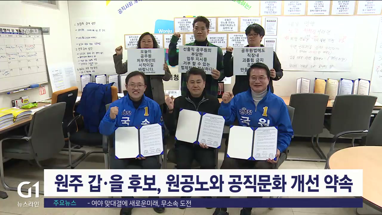 4월 총선을 앞두고 원주 갑·을 선거구 여야 후보들과 원주시청 공무원노조가 '갑질 근절·클린 공직문화 실천' 협약을 맺었습니다.