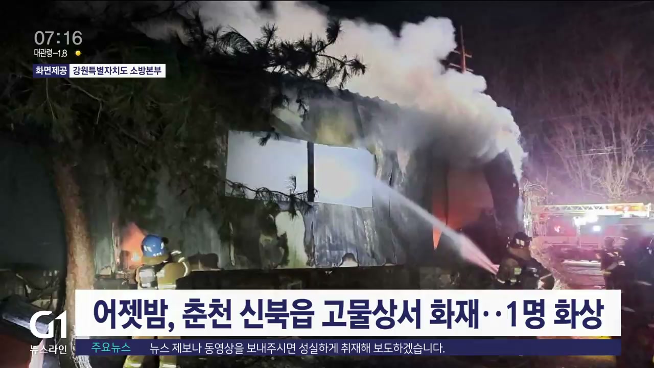 어젯밤, 춘천 신북읍 고물상서 화재..1명 화상