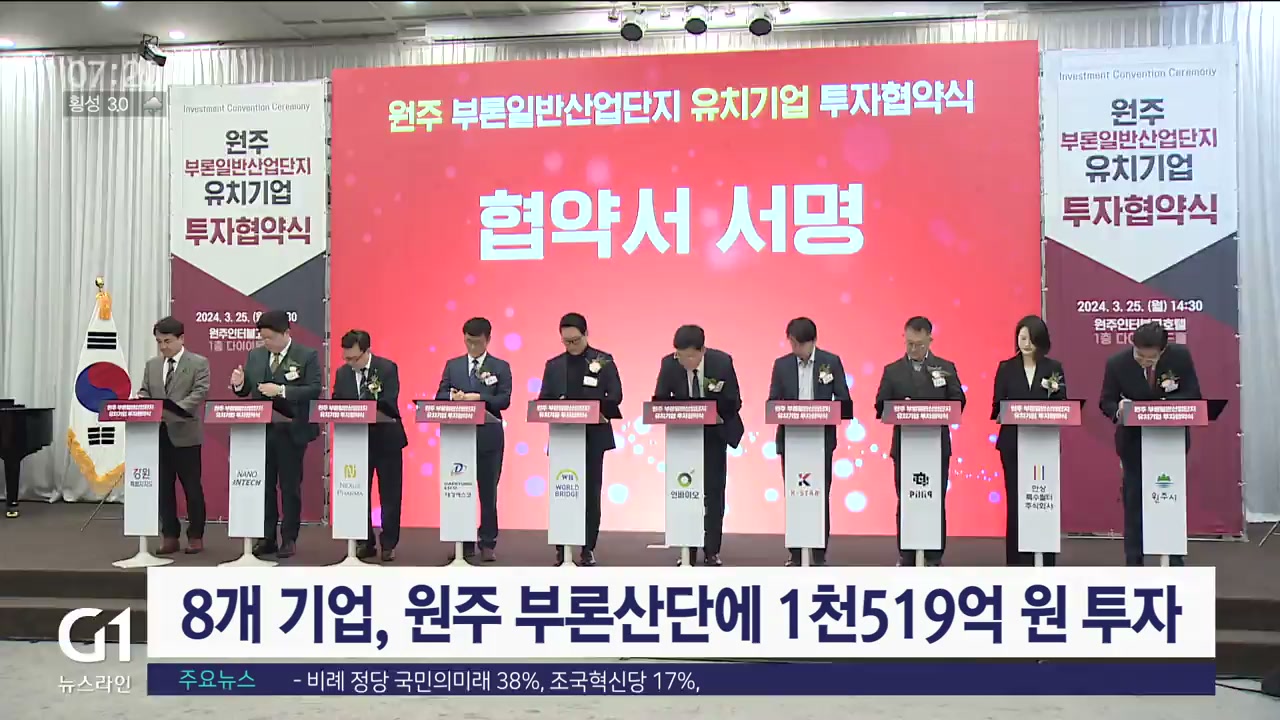 강원특별자치도, 원주시와 부론일반산업단지 입주 예정 8개 기업이 대규모 투자협약을 맺었습니다.