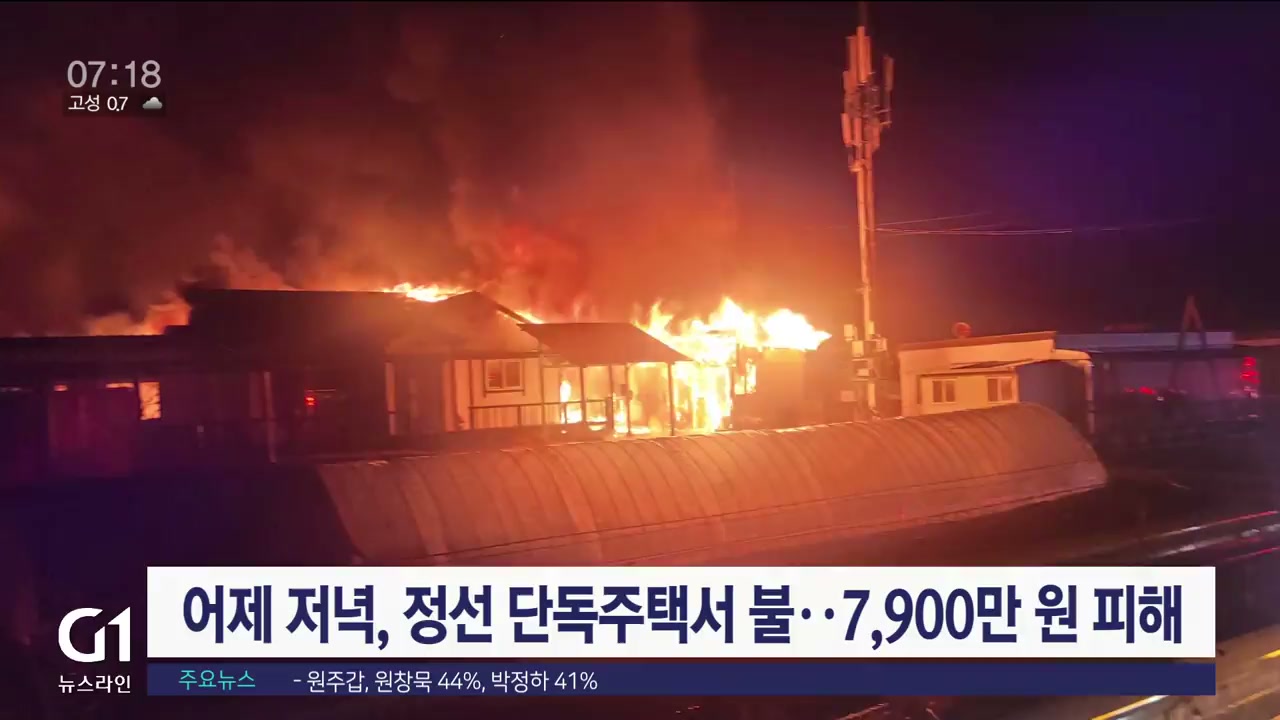 어젯밤 11시 10분쯤엔 정선군 정선읍의 한 단독주택에 불이 나 1시간 20여 분 만에 꺼졌습니다.