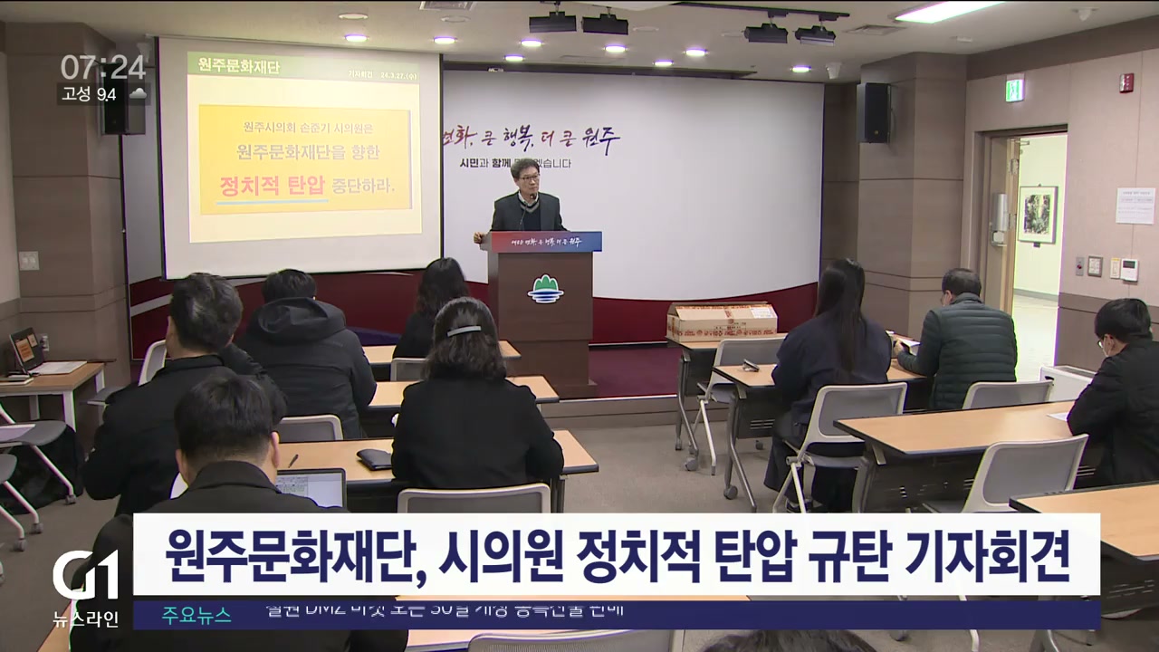 원주문화재단 박창호 대표이사는 어제(27일) 원주시청에서 기자회견을 열고 특정 원주시의원이 원주문화재단을 향해 정치적 탄압을 이어간다며 규탄했습니다.