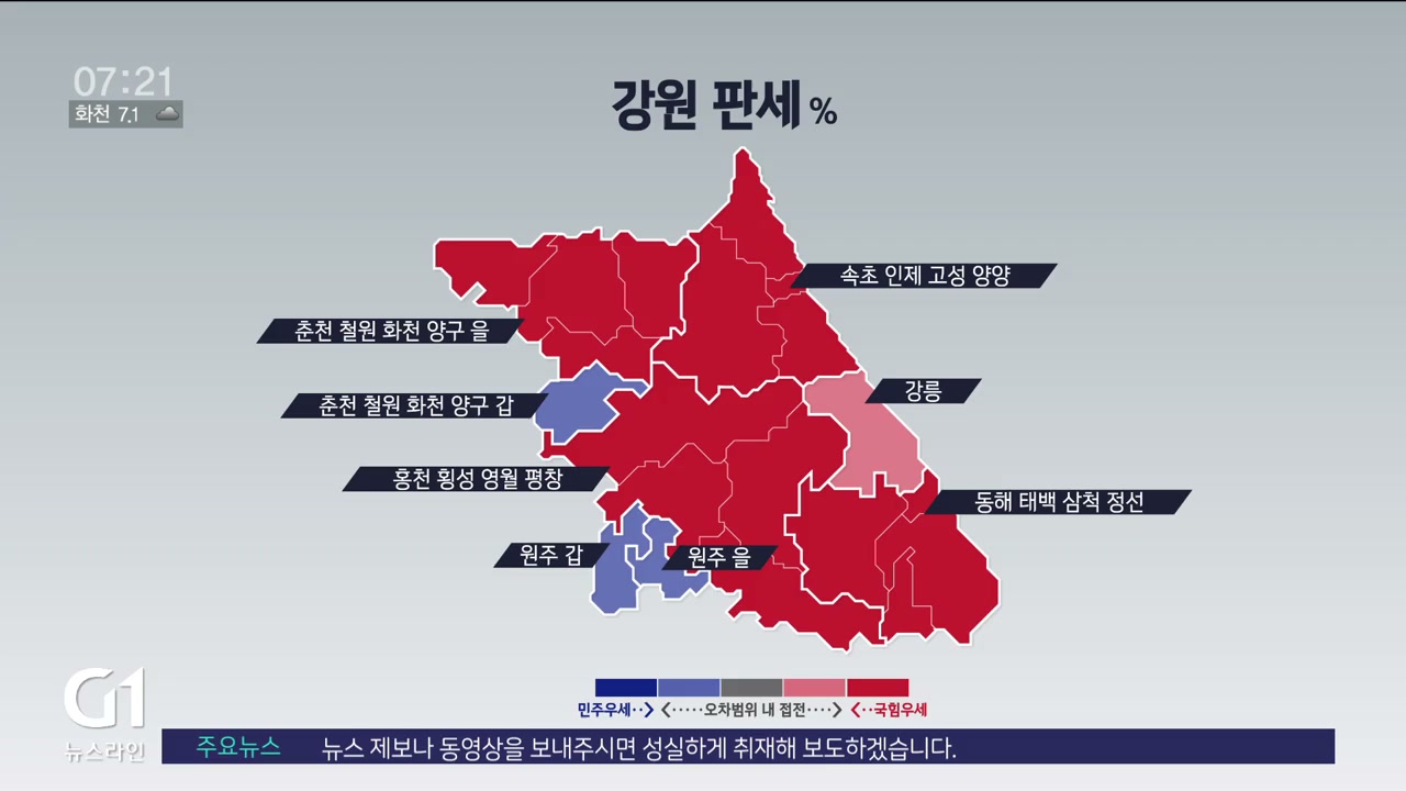 춘천 갑, 원주 갑/을, 강릉 네곳은 국민의힘과 민주당 후보의 지지율이 오차 범위 안에 들어와 있습니다./