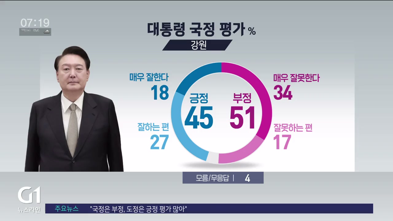 윤석열 대통령의 국정운영에 대해선 부정적 평가가 51%로, 긍정 평가 45%에 비해 높게 나왔습니다.