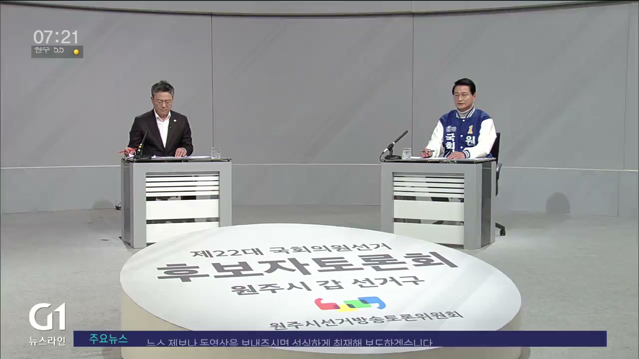 리턴매치이자 최대 격전지로 관심을 끌고 있는 원주 갑 선거구 정책 토론회가 열렸습니다.