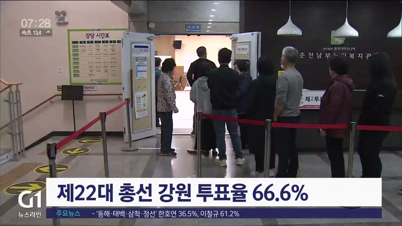 제22대 국회의원선거가 마감된 가운데, 강원특별자치도는 88만여 명이 투표해 투표율 66.6%로 잠정 집계됐습니다.