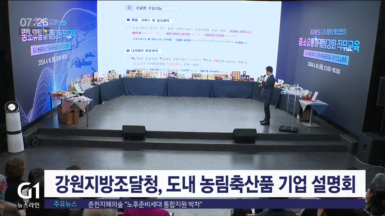 강원지방조달청은 어제(16일) 춘천 소담스퀘어에서 농림축산 가공품의 국내외 공공조달시장 진출 지원을 위한 설명회를 열었습니다.