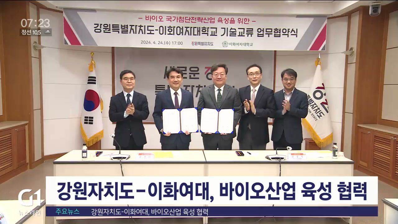 강원자치도는 어제(24일) 도청에서 이화여자대학교와 바이오 국가첨단전략산업 육성을 위한 기술교류 업무 협약을 체결했습니다.