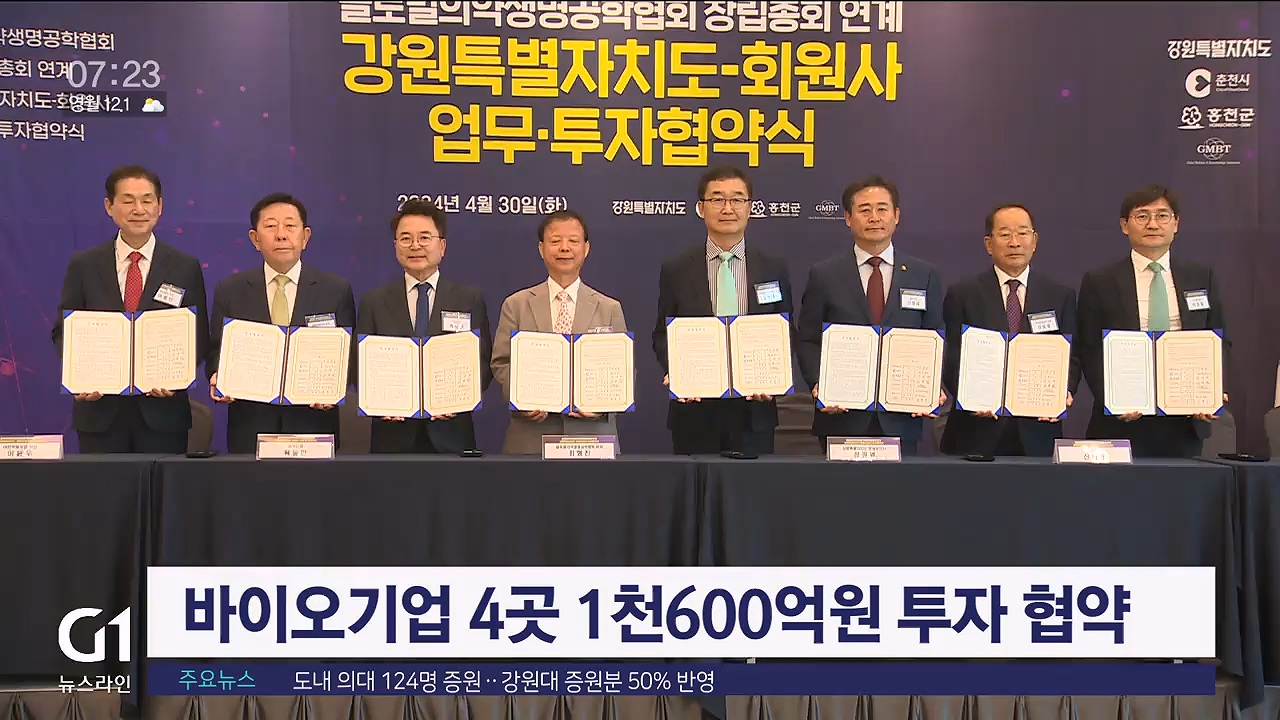 강원자치도와 춘천시, 홍천군, 글로벌 의약생명공학협회는 어제(30일) 바이오 기업들과 천600억 원의 투자협약을 체결했습니다.