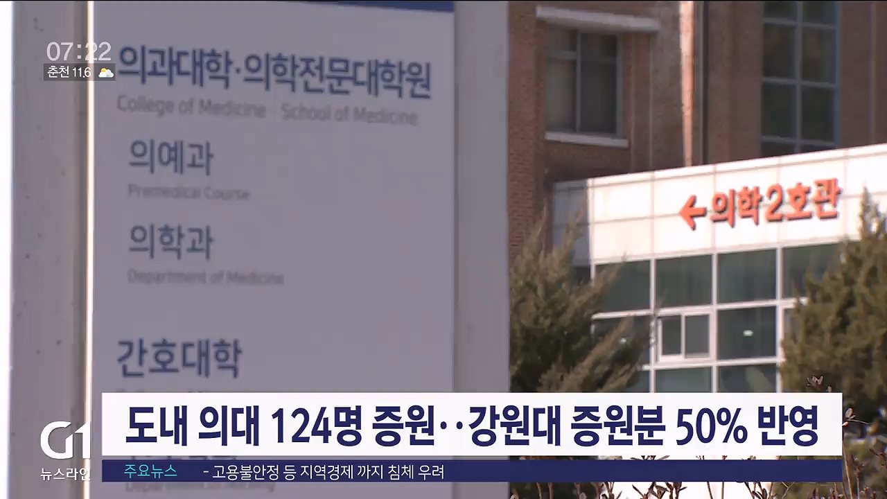 도내 의대 124명 증원..강원대 증원분 50% 반영