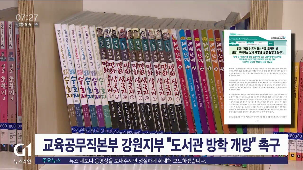교육공무직본부 강원지부는 어제(7일) 성명을 통해 "좋은 시설과 조건을 갖추고도 도내 학교 도서관이 폐쇄되거나 제대로 운영되지 않고 있다"며 "지역 문화센터로 기능할 수 있도록 개방해야 한다"고 주장했습니다.