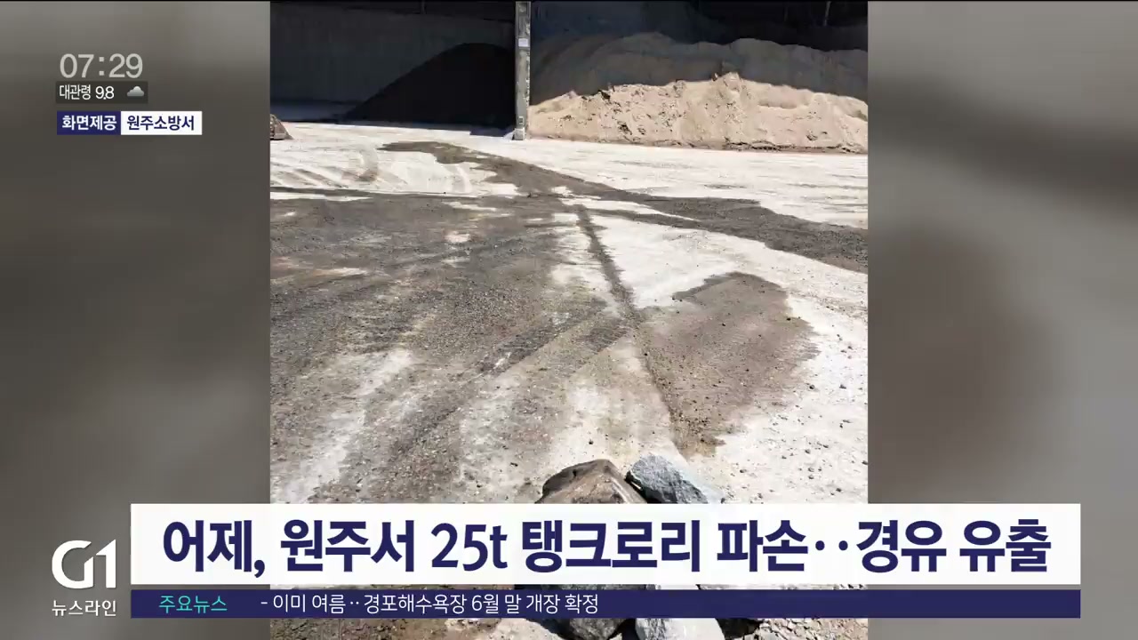 어제(29일) 낮 12시 50분쯤 원주시 흥업면의 한 공장 앞에서 25톤 탱크로리의 밸브 부분이 파손돼 경유 200리터 가량이 유출됐습니다.