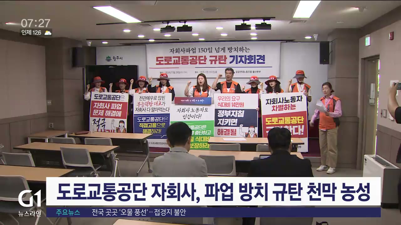 도로교통공단 자회사인 도로교통안전관리는 어제(29일) 원주시청에서 기자회견을 열고 다섯달 넘게 파업을 방치하고 있는 도로교통공단을 규탄했습니다.