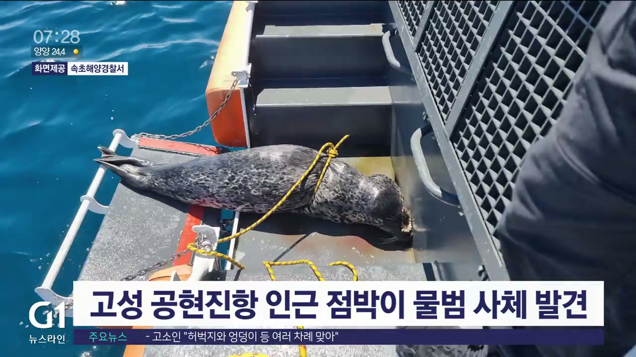 어제(26일) 오전 11시 30분쯤 고성 공현진항 인근 150m 해상에서 점박이 물범이 죽은 채 발견됐습니다.
