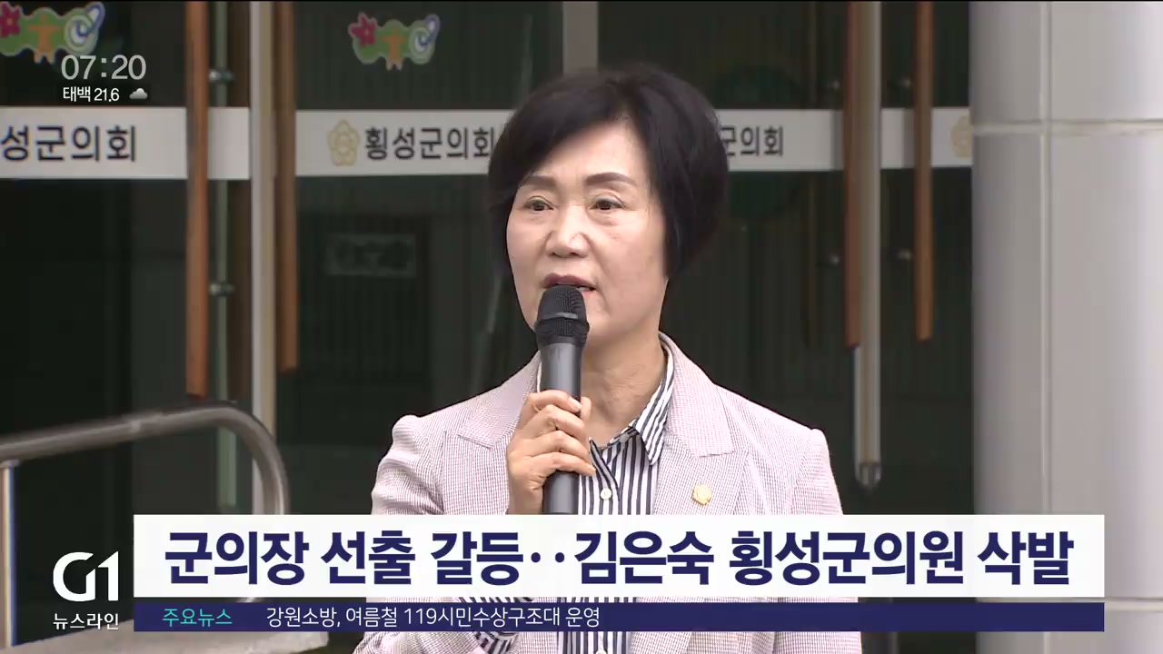 횡성군의회는 최근 후반기 의장으로 국민의힘 표한상 의원을 선출한 직후 경합했던 같은당 김은숙 의원이 탈당하는 등 내홍을 치렀습니다.
