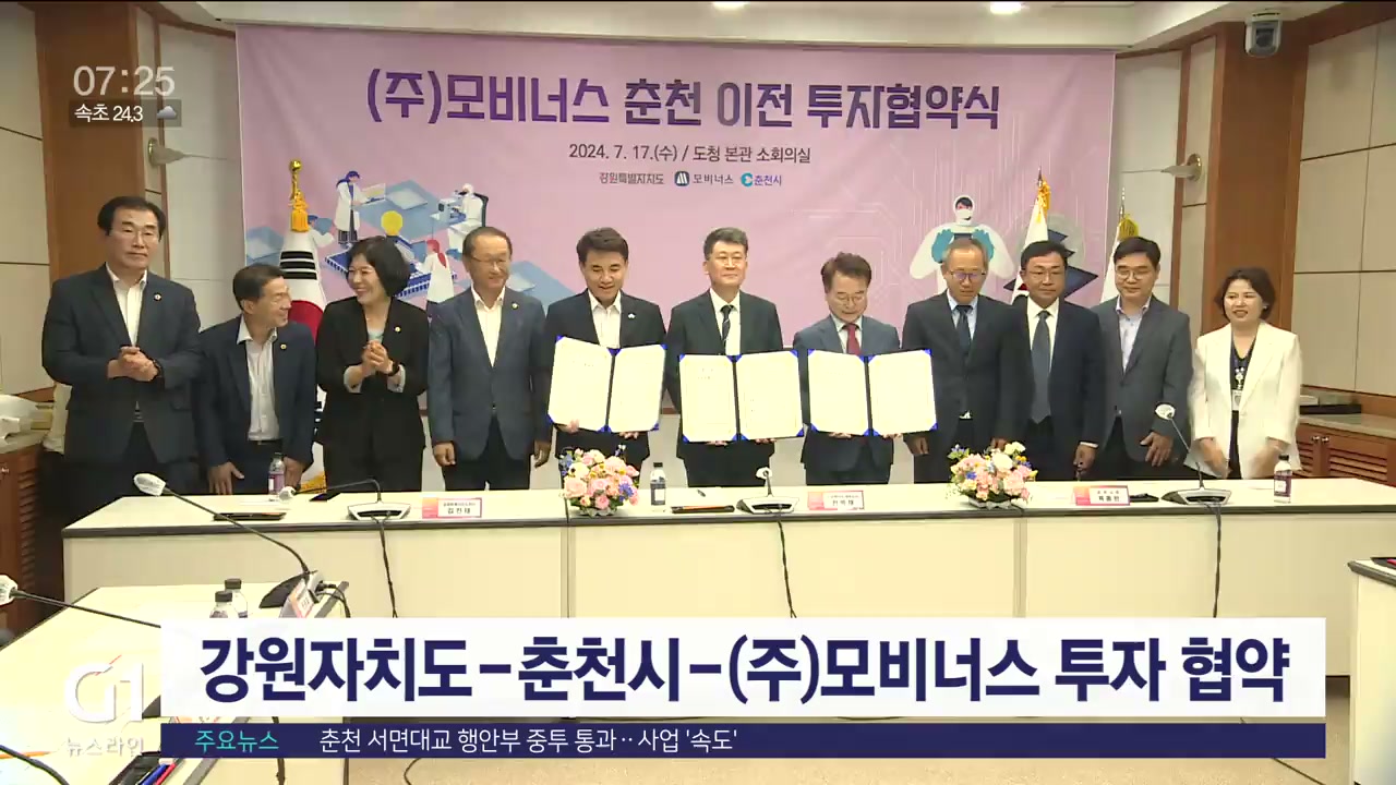 강원자치도와 춘천시는 어제(17일) 도청에서 반도체 관련 기업인 주식회사 모비너스와 투자협약식을 체결했습니다.