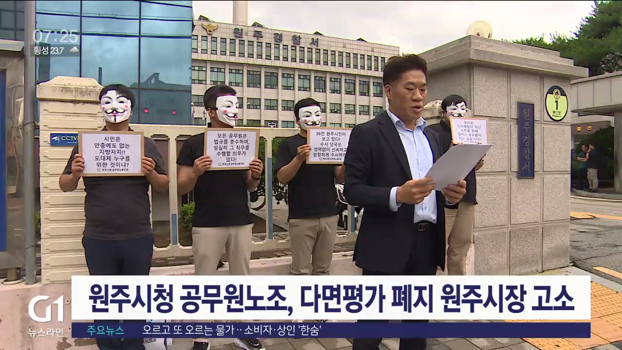 공무원 노조는 원주경찰서 앞에서 기자회견을 열고 원강수 시장을 비롯해 박동주 강원자치도 감사위원장과 다면평가 폐지 관련 인사위원회 심의에 참석한 원주시 인사위원장 등을 직권남용죄와 직무유기죄로 고소한다고 밝혔습니다.