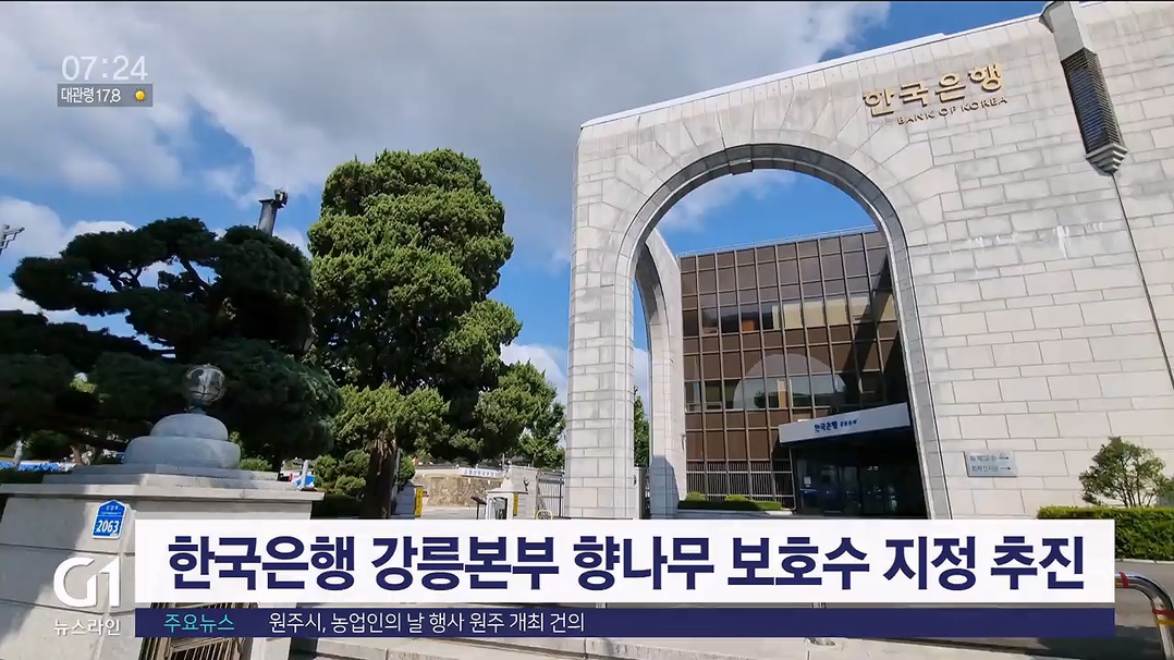 한국은행 강릉본부 향나무는 지난 1930년대 일제 강제 공출 명령에 따라 강동면 모전리에 있던 향나무를 마을 청년 20여명이 8.5km 가량 떨어진 현 부지로 이식한 뒤 보호해 왔습니다.