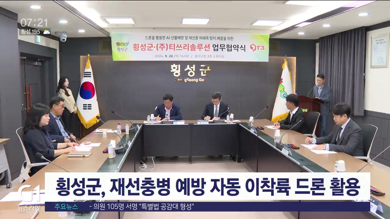 횡성군은 어제(26일) 주식회사 티쓰리솔루션과 업무협약을 맺고 소나무 재선충병 초분광 카메라 촬영 공간과 인프라 제공, 자동 이착륙 가능한 드론 활용 등에 협력하기로 했습니다.
