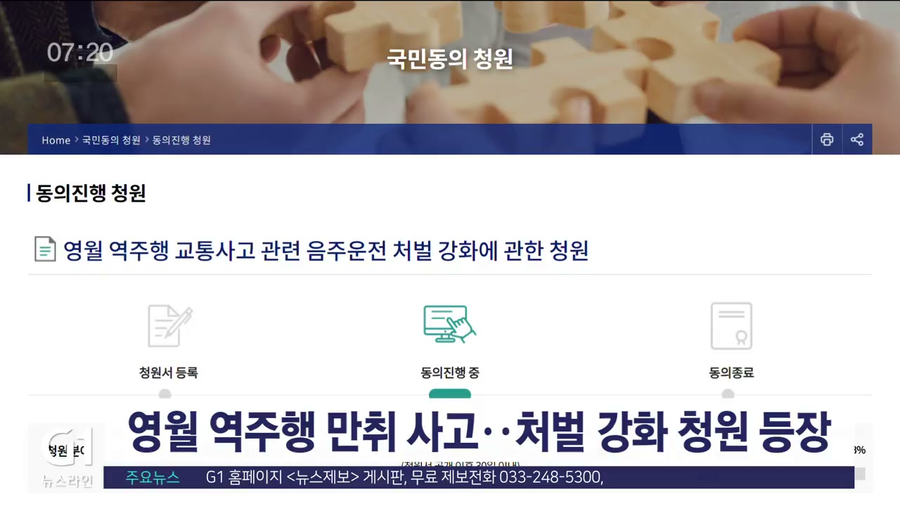 지난달 30일 국회 국민동의 청원에는 '영월 역주행 교통사고 관련 음주운전 처벌 강화에 관한 청원'이 게시됐습니다.
