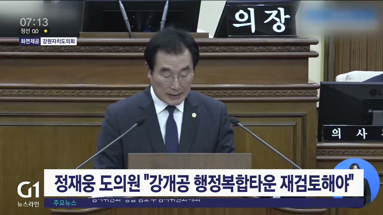 제333회 정례회 첫 날인 어제(5일) 정재웅 도의원은 5분 발언에서 "강원개발공사의 행정복합타운사업은 알펜시아의 복사판이자 춘천시 지역균형 붕괴의 신호탄"이라고 지적했습니다.