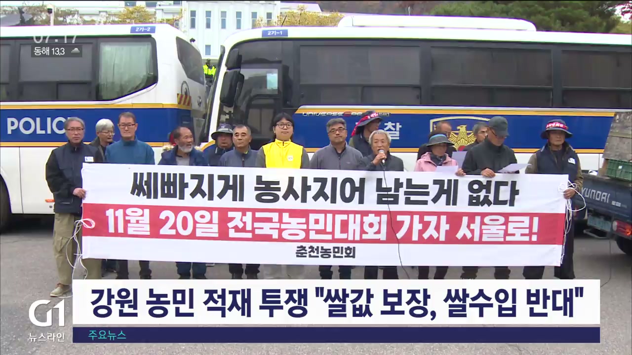 전국농민회총연맹 강원도연맹 소속 농민들은 "쌀값이 10개월째 추락하고 있다"며, "정부가 쌀 수입을 중단해 쌀값 안정을 도모하고 쌀 재협상을 통해 수입쌀 대책을 마련해야 한다"고 주장했습니다.