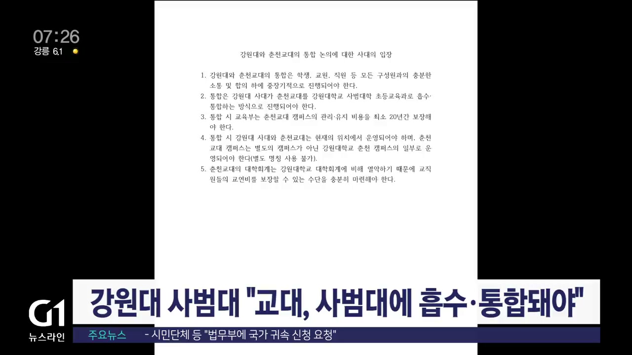 강원대 사범대학은 입장문을 통해 "통합은 대학 구성원들과의 소통과 합의하에 중장기적으로 진행돼야 한다"며 "춘천교대를 강원대 사범대학 초등교육과로 흡수 통합하는 방식으로 진행해야 한다"고 주장했습니다.