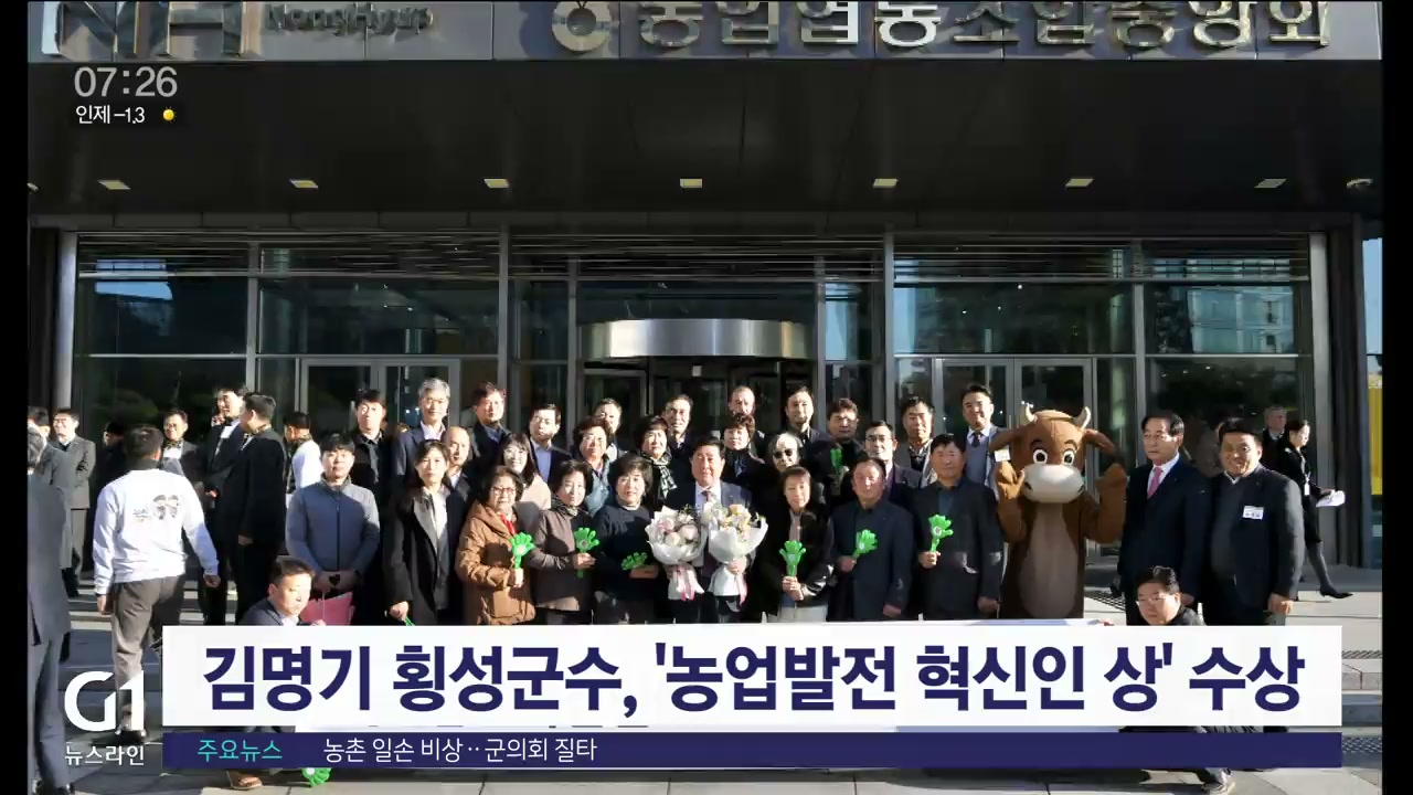 김명기 횡성군수가 농협중앙회에서 주관한 '2024년 농업발전 혁신인 상'을 수상했습니다.