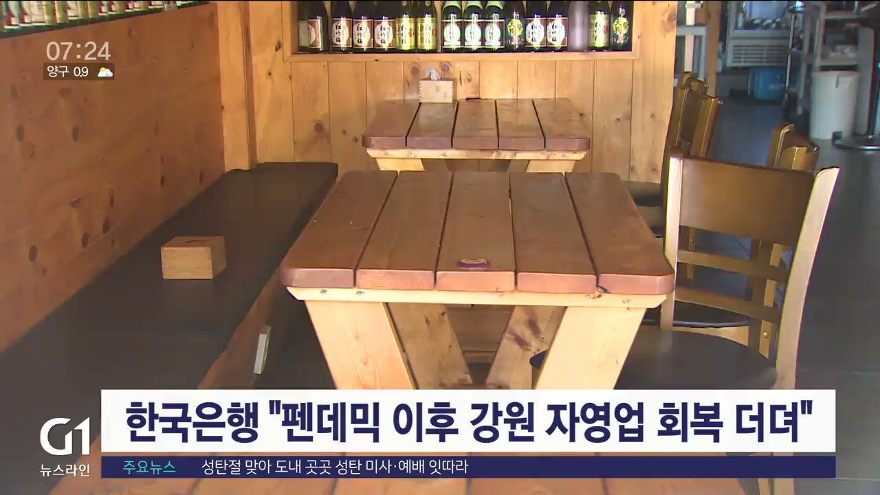 한국은행 강원본부는 지난 2019년 대비 엔데믹이 선언된 지난해 상반기 대면 서비스업에 종사하는 전국 자영업자는 1.1% 증가했지만, 강원지역 자영업자는 10.6% 감소했다고 밝혔습니다.