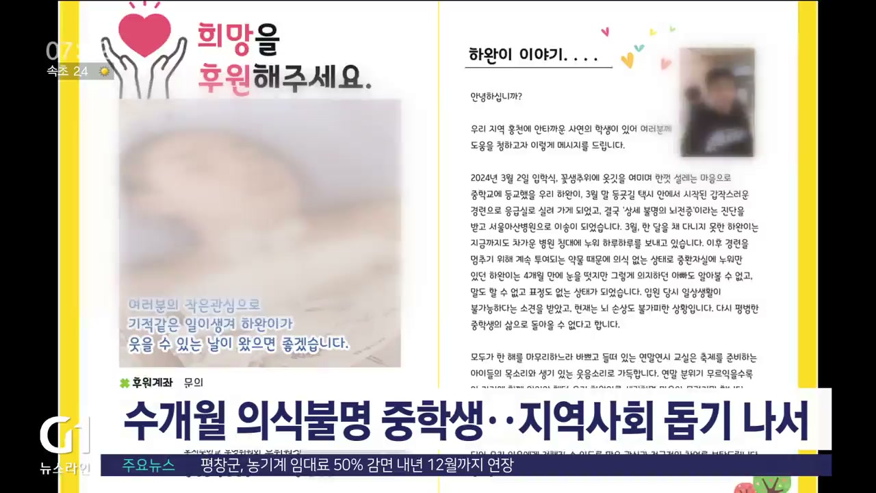 최하완 군이 한 부모 가정인데다 수천만 원에 달하는 치료를 감당할 수 없게 되자 학생들과 학부모, 홍천군 청년연합회 등 지역사회가 성금 모금 활동에 나섰습니다.