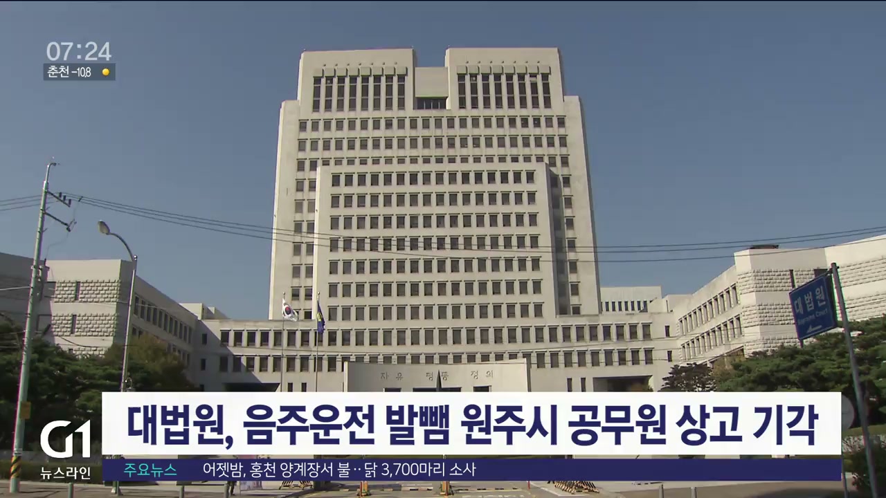 법조계에 따르면 대법원은 음주운전 혐의를 받는 원주시 소속 공무원 A씨의 상고를 기각했습니다.