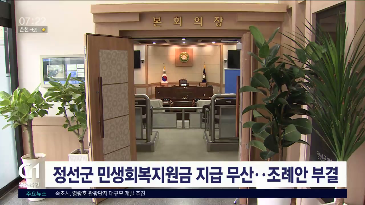 정선군의회는 제303회 임시회에서 '정선군 재난기본소득 지급 조례 전부개정 조례안'을 절차 미흡과 협의 부족 등을 이유로 부결했습니다.
