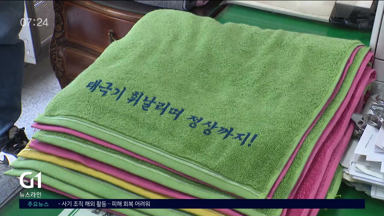 수건에 '태극기 휘날리며 정상까지'라는 문구가 적혀있습니다.