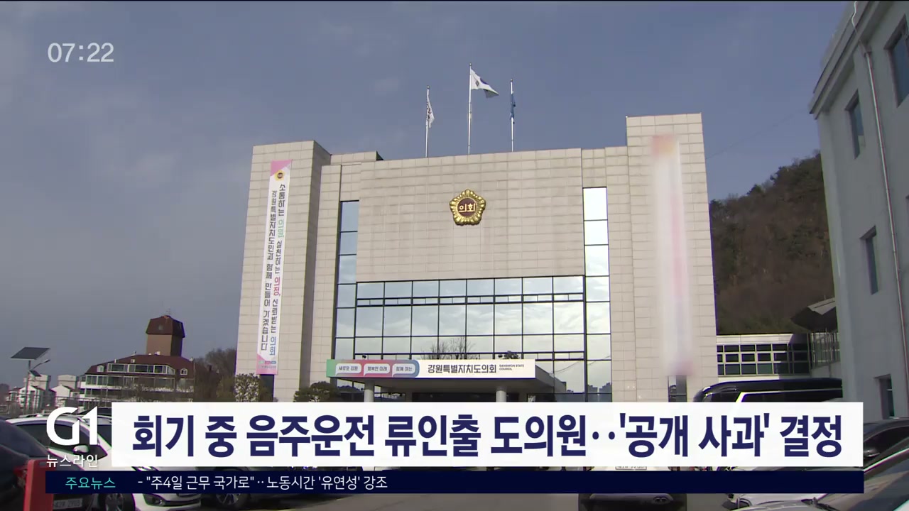 강원자치도의회 회기 중 음주 운전을 하다 적발된 류인출 도의원이 '공개회의에서의 사과' 징계를 받았습니다.