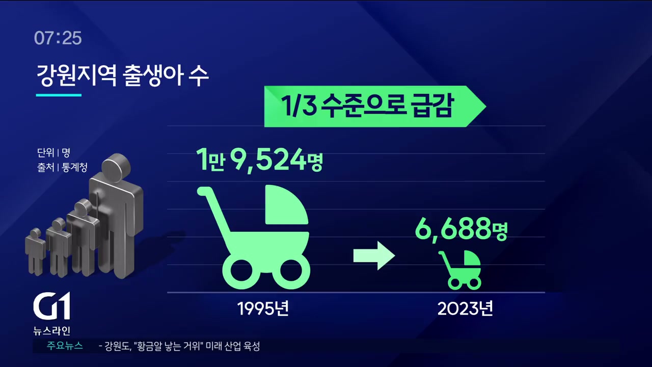 /1995년 강원 지역 출생아 수는 1만 9,524명. 2023년 출생아 수는 6,688명으로 1/3 수준으로 떨어졌습니다./