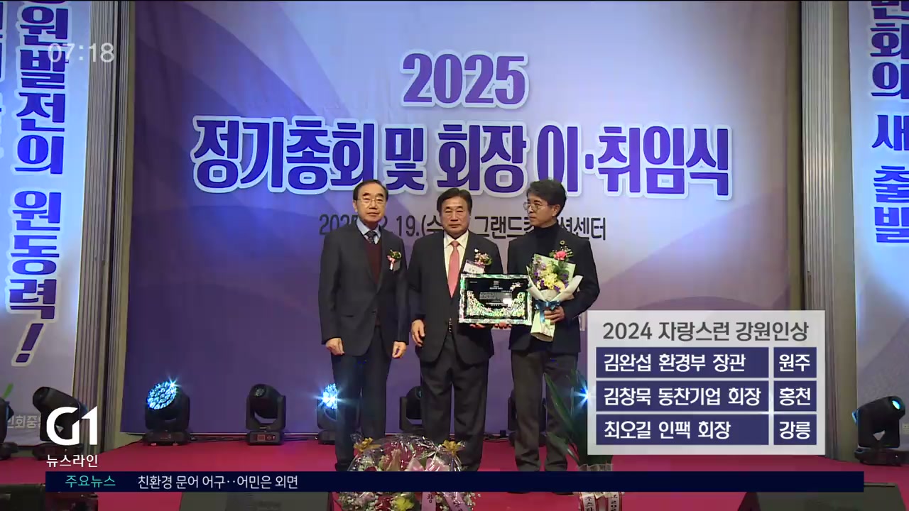 자랑스러운 강원인에는 원주 출신 김완섭 환경부 장관과 홍천 출신 김창묵 동찬 기업 회장, 강릉 출신 최오길 인팩 회장이 선정돼 수상했습니다.