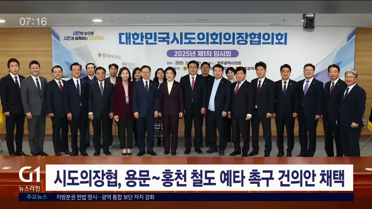 용문~홍천 광역철도 예비타당성조사 촉구 건의안이 어제(20일) 광주광역시의회에서 열린 대한민국시도의회의장협의회 임시회에서 가결됐습니다.