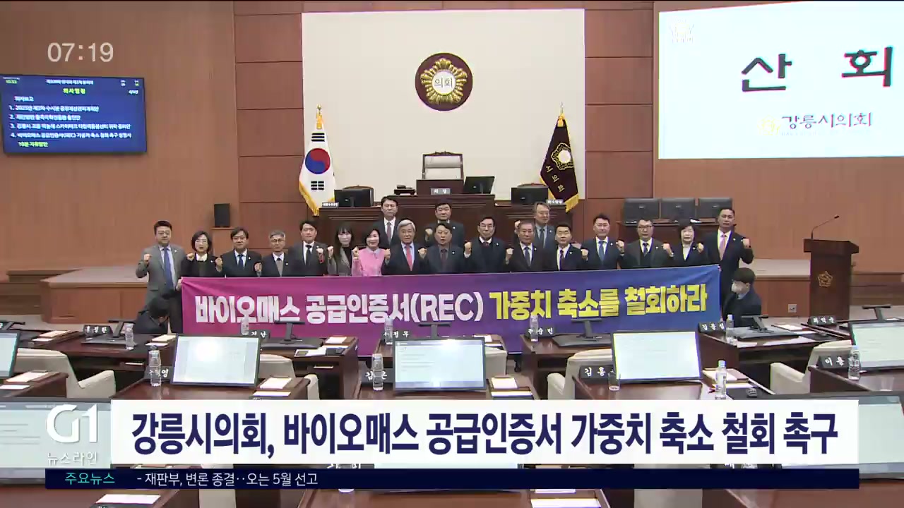 강릉시의회는 '제320회 임시회 2차 본회의'에서 성명서를 발표하고, '정부의 바이오매스 발전소 공급인증서 가중치 축소 방침은 지역 경제를 심각하게 위협할 것'이라고 지적했습니다.