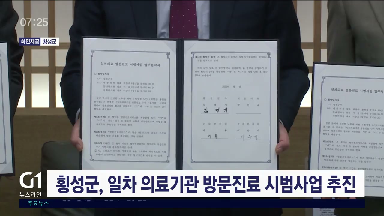 횡성군이 노인 의료 서비스 향상을 위해 지역의 3개 의원급 의료기관과 '일차 의료기관 방문진료 시범사업' 업무 협약을 체결했습니다.