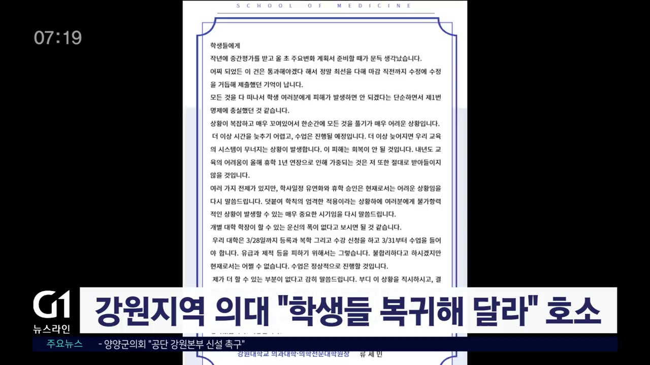 류세민 강원대 의과대학·의학전문대학장은 학내 게시판을 통해 "더 이상 시간을 늦추기 어렵고, 더 늦어지면 우리 교육의 시스템은 무너지게 될 것"이라며,