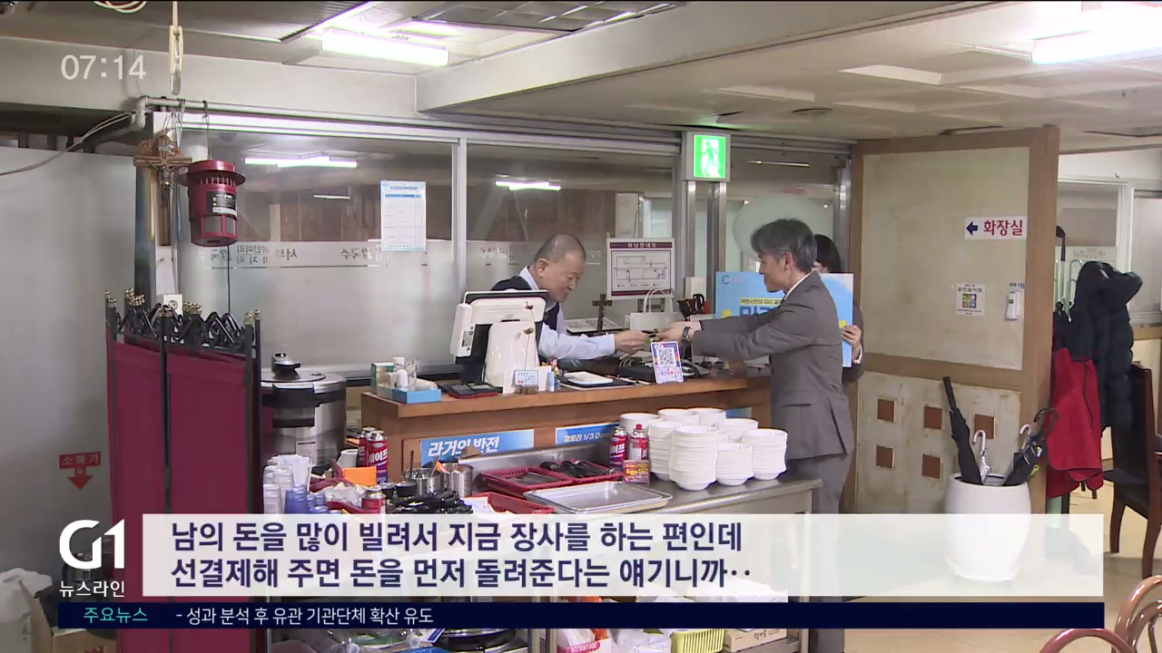 "요즘 같이 경기가 좀 힘들 때 선결제라고 하면 돈을 먼저 주시는 거니까 가게 운영하는 데 도움이 많이 되죠. 남의 돈을 많이 빌려서 지금 장사를 하는 편인데 선결제 해주면 돈을 먼저 돌려준다는 얘기니까.."