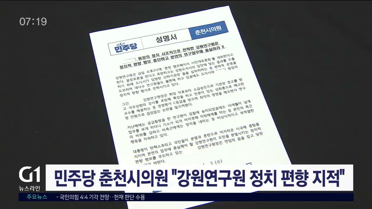 더불어민주당 소속 춘천시의원들이 성명서를 내고 "강원연구원은 정치적 편향 행보를 중단하고, 본연의 연구업무에 충실하라"고 촉구했습니다.