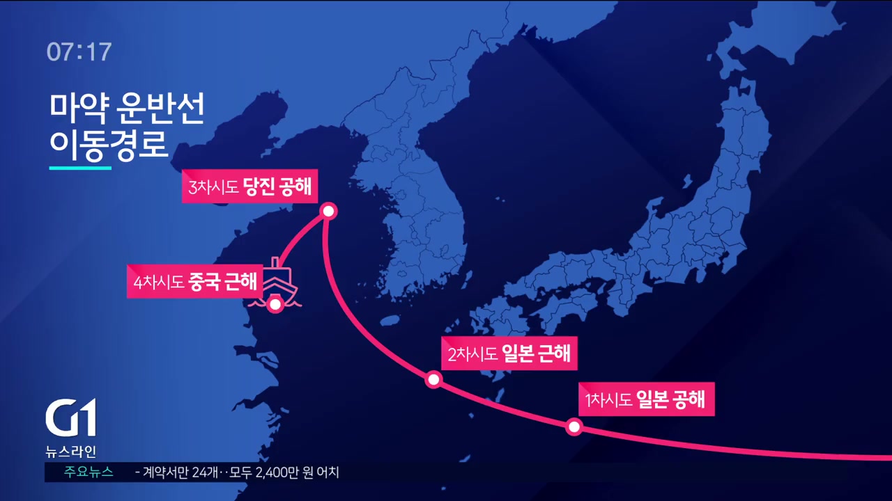 /마약 화물선은 충남 당진항으로 향하는 길에 일본 공해와 근해에서 대기 선박과 만나 두 차례 마약 전달을 시도했지만 실패하고,