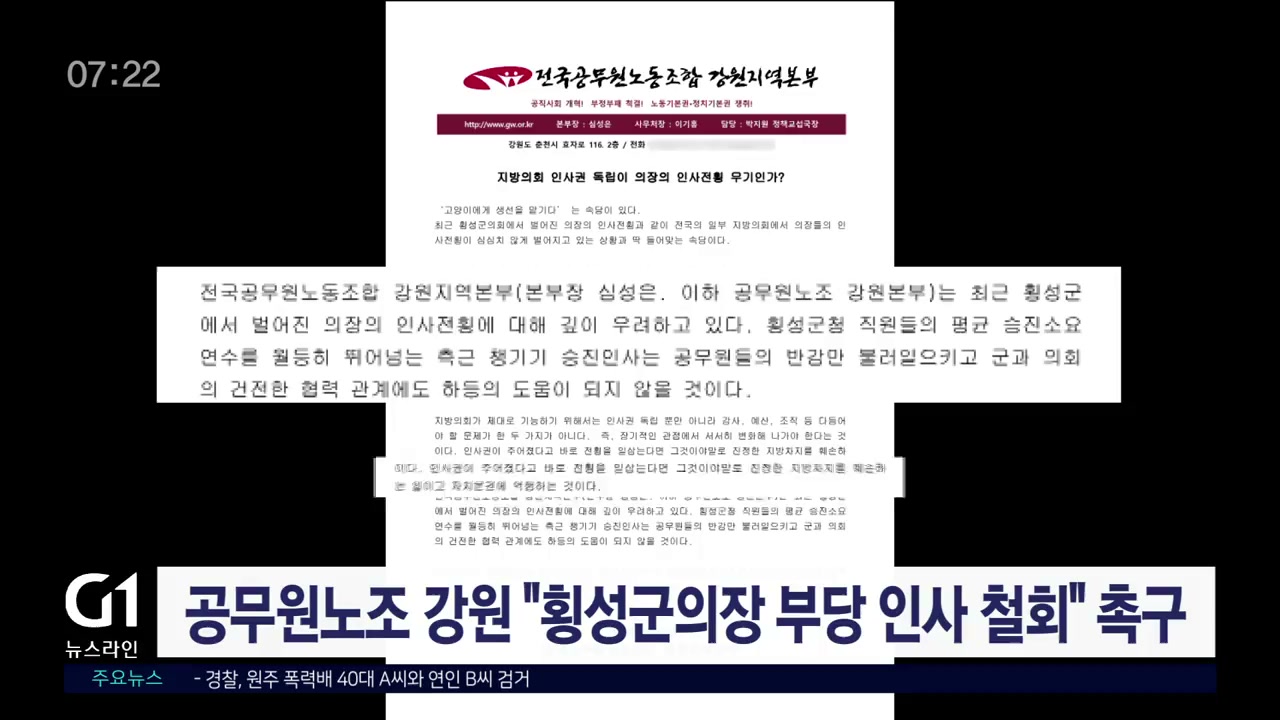 전공노 도지부는 성명을 통해 "횡성군청 직원의 평균 승진소요 연수를 월등히 뛰어넘는 승진 인사는 공무원의 반감만 일으키고 군과 의회의 건전한 협력 관계에도 도움이 되지 않는다"고 비판했습니다.