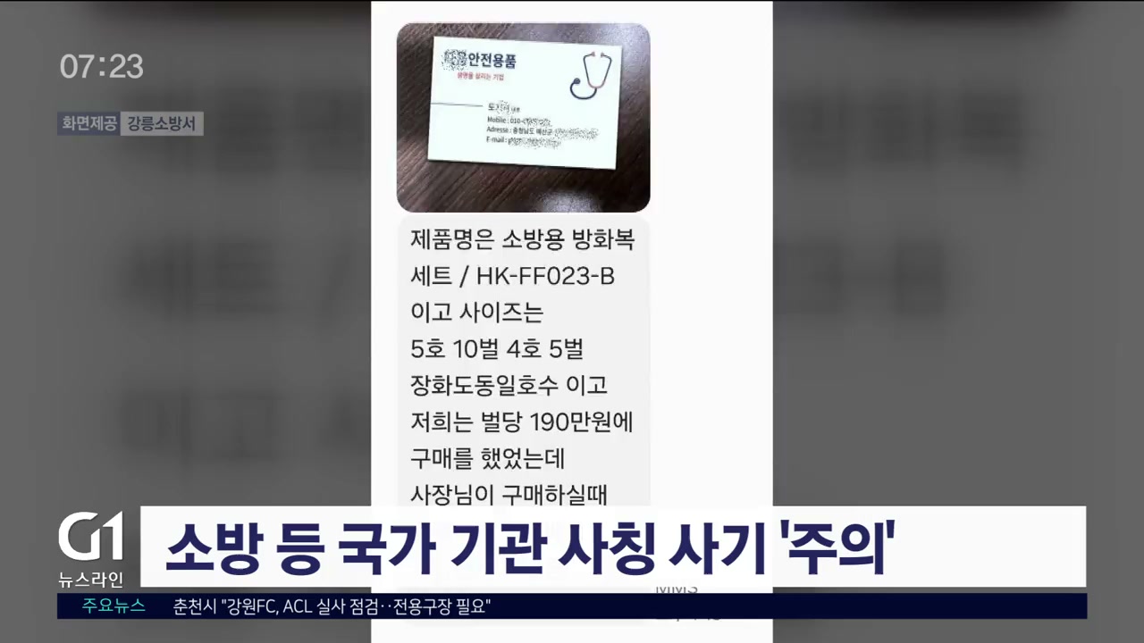 강릉소방서에 따르면 지난 9일 소방서를 사칭한 일당이 한 생활용품점에 3천만 원 상당의 소방 피복 대리 구매 요청을 시도했습니다.